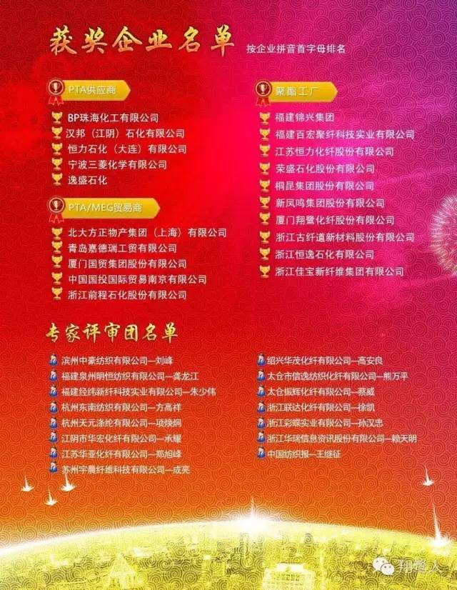 本次獲獎(jiǎng)的企業(yè)不僅在“第十五屆中國(guó)杭州化纖論壇”現(xiàn)場(chǎng)被授予2015年度中國(guó)聚酯業(yè)十佳供應(yīng)商證書(shū),還將享有在中國(guó)化纖信息網(wǎng)及CCFgroup“中國(guó)聚酯十佳供應(yīng)商”欄目進(jìn)行圖標(biāo)鏈接,有助于樹(shù)立良好的企業(yè)品牌形象和收獲更多的社會(huì)影響力。