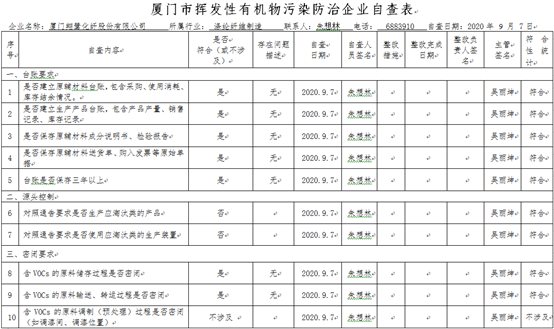 廈門市揮發性有機物污染防治企業自查表 (2020年 第三季度)